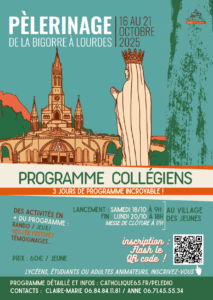Du 16 au 21 octobre prochains, 5000 catholiques des Hautes-Pyrénées se feront pèlerins d’espérance, au sanctuaire Notre-Dame de Lourdes. Il est temps, en effet, de préparer ce rendez-vous annuel. Comme chaque année, ce sont les enfants des écoles catholiques qui ouvriront l’évènement : les classes de la CP au CM2 se retrouveront dans la cité mariale, avec les équipes éducatives, pour découvrir le message de Lourdes et le visage de sainte Bernadette. Notre établissement participera à ce pèlerinage le jeudi 16 octobre.